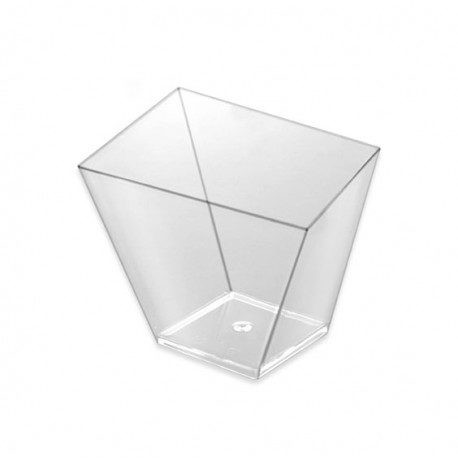 Vasos degustación catering asimétricos en plástico transparente desechables. Vasitos rombo degustación para Catering originales, prácticos y de alta calidad aptos para presentar todo tipo de aperitivos. Fabricados en poliestireno alimentario efecto cristal. Capacidad: 180ml/180cc. Medidas: 7,5 x 7cm.