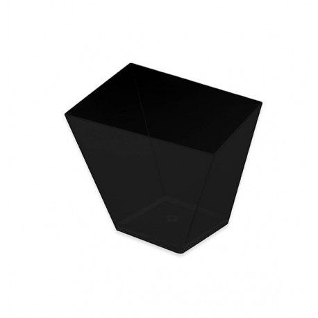 Vasos degustación catering asimétricos en plástico negro desechables. Vasitos rombo degustación para Catering originales, prácticos y de alta calidad aptos para presentar todo tipo de aperitivos. Fabricados en poliestireno alimentario efecto cristal. Capacidad: 180ml/180cc. Medidas: 7,5 x 7cm.