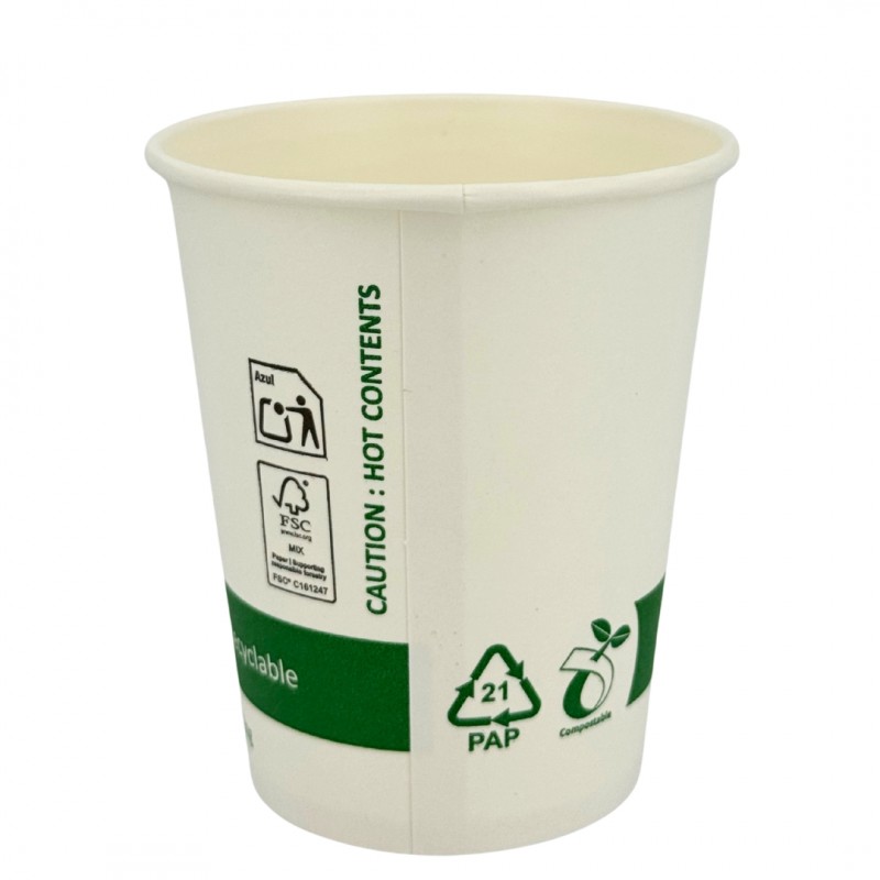 Vasos ecológicos de papel modelo Friendly de 200ml/200cc, fabricados en cartón compostable y biodegradable, ideales para café y bebidas en cafeterías, hostelería, eventos y servicios take away, con diseño blanco y detalles verdes.