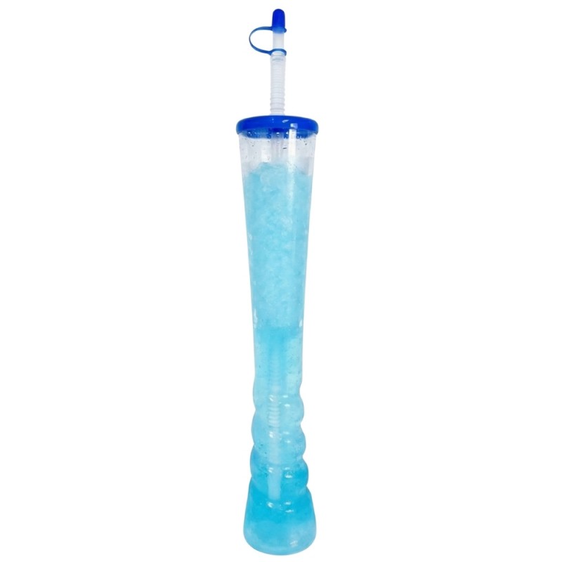Vasos Yarda de plástico de 600 ml en PET alimentario con tapa y pajita en PP, altura de 35,3 cm y base de 6,7 cm, ideales para bebidas frías o templadas en fiestas y negocios que buscan una presentación divertida y práctica.