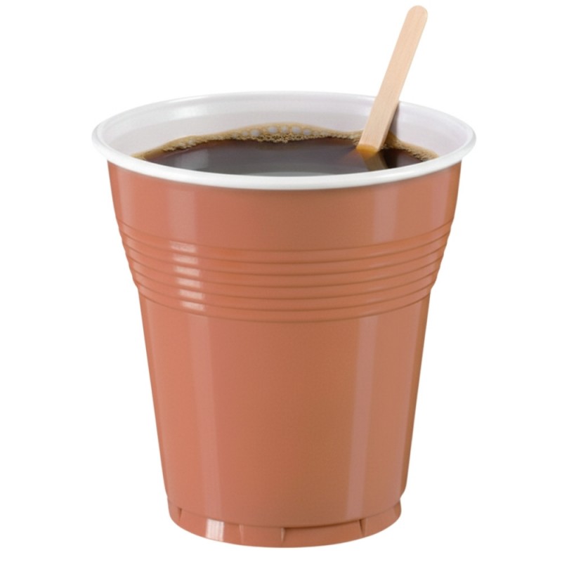 Los vasos de plástico bicolor vending son la solución ideal para máquinas expendedoras y servicios de autoservicio en entornos profesionales. Están fabricados en poliestireno (PS), un material rígido y ligero que garantiza una experiencia segura al servir tanto bebidas frías como calientes. Su diseño en dos tonos, marrón por fuera y blanco por dentro, aporta un toque distintivo sin renunciar a la funcionalidad en el uso diario.